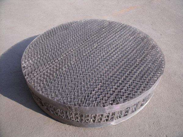絲網(wǎng)波紋填料在操作時,回流液在其外表以一種通暢的Z字形運動,沿網(wǎng)面向下。因為絲網(wǎng)激烈的毛細效果,填料外表就形成了均勻完好的薄膜,液膜厚度僅0.08mm。氣體經(jīng)過規(guī)矩擺放的傾斜通道上升,流體阻力小,因為這種填料互相交織90度;擺放,氣液兩相均勻分布在塔截面上,也易傳質(zhì)。不銹鋼絲網(wǎng)波紋片小開有小也,加強液體均布,減少填猜中的死角(特別是小塔),進步別離功率。